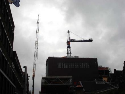 In verbouwingen: Er moest een nog grotere hijskraan aan te pas komen, maar de grote hijskraan in de Stadsschouwburg Amsterdam is deze week verwijderd. Dat betekent dat de afbouwfase van de nieuwe -pardon Rabo- zaal is begonnen.