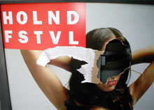 Het affiche van het Holland Festival wordt niet door iedereen gewaardeerd, getuige dit vernielde billboard in Amsterdam Oost.